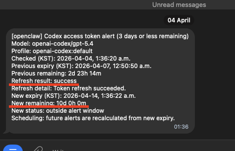 Codex Auth Token 만료된다는 알람과, 실제 RT로 자동 갱신하는 로직이 잘 동작한다. 야호!